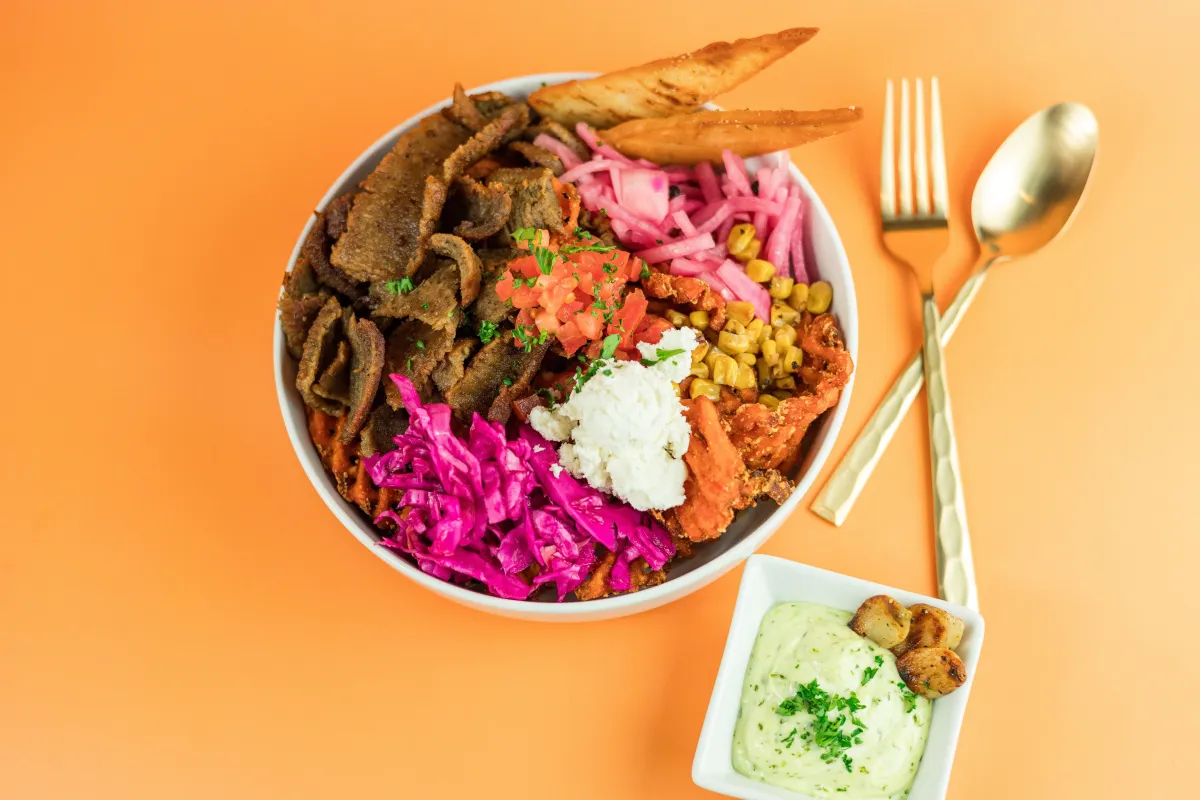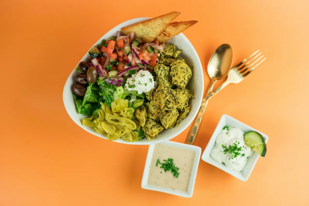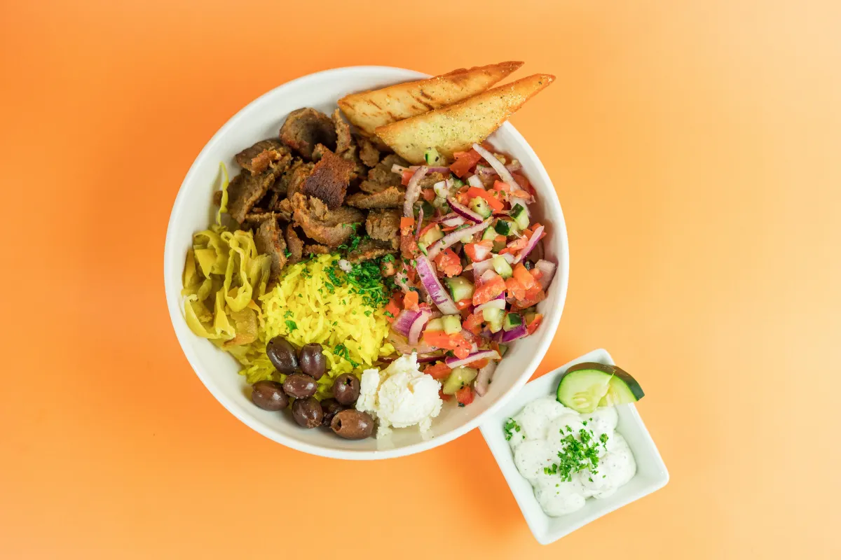A: We offer a wide range of vegan and vegetarian-friendly Greek food. Guests can enjoy our Falafel, Zaatar-Seasoned Hummus, turmeric rice, and fresh vegetable toppings. Most of our signature sauces, like our Skhug and Roasted Red Pepper, are also vegan.